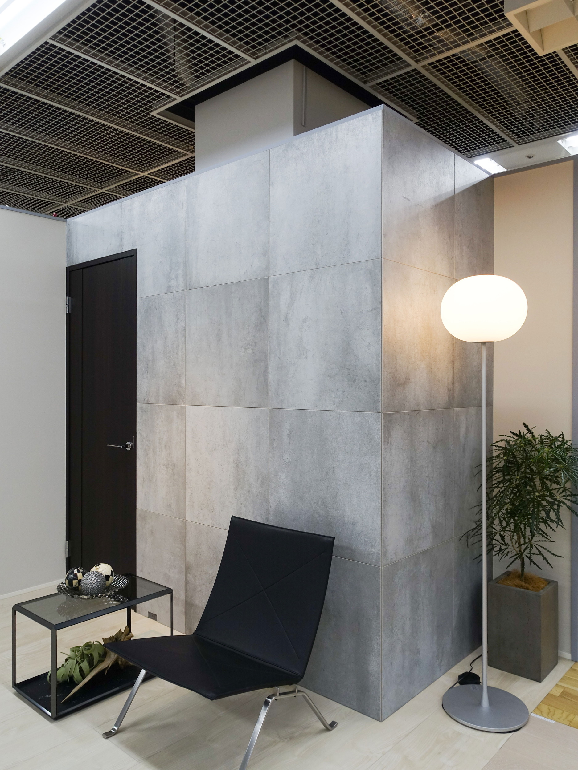 勤続の鈍い光沢と酸化してくすんだ色合いが混ざるシリーズ。都会的で洗練された雰囲気とインダストリアルテイストの無骨さを併せ持つメタル調のタイルです。
