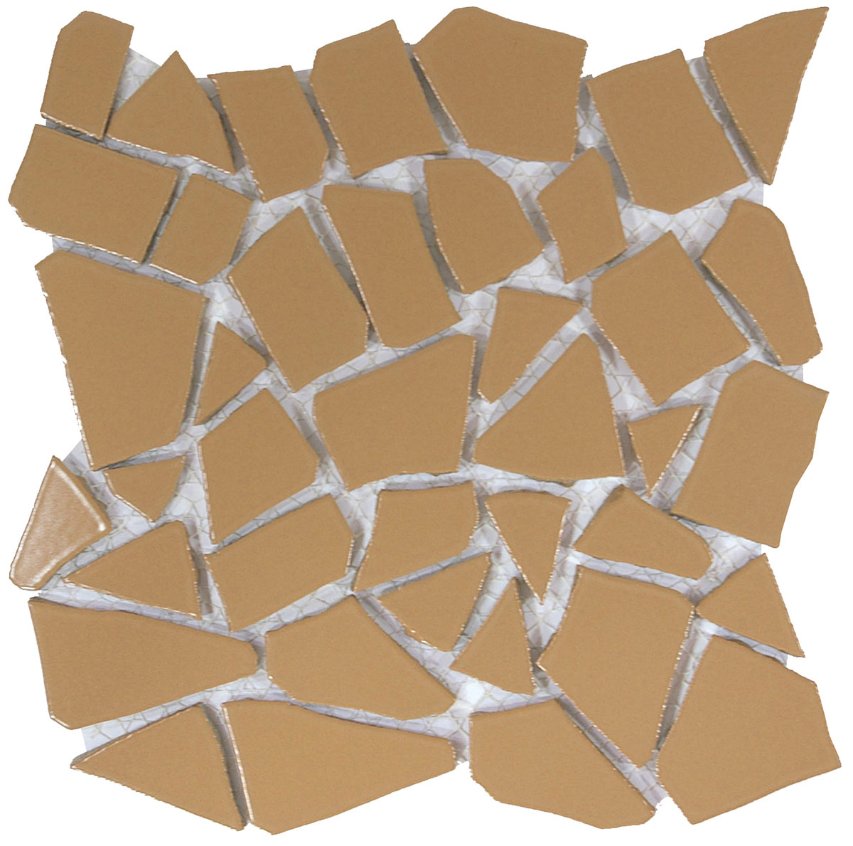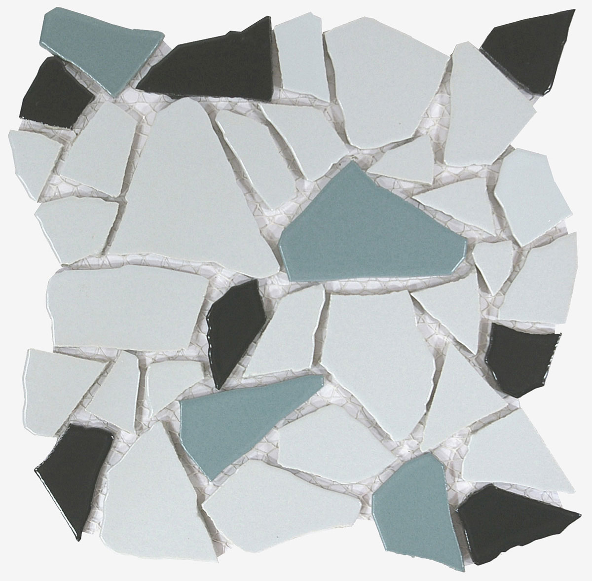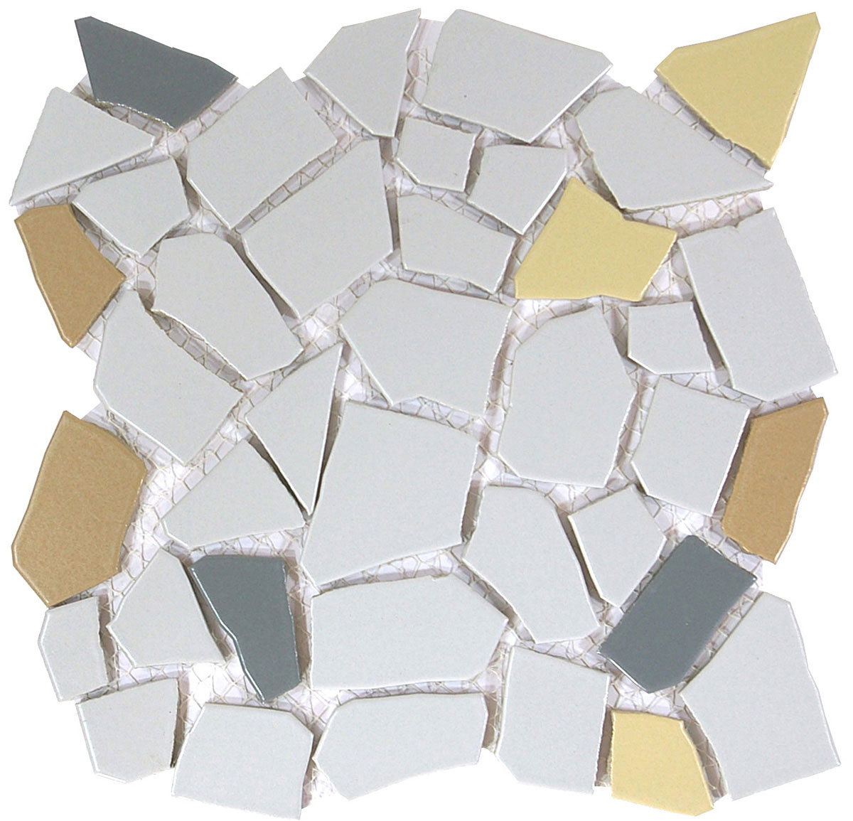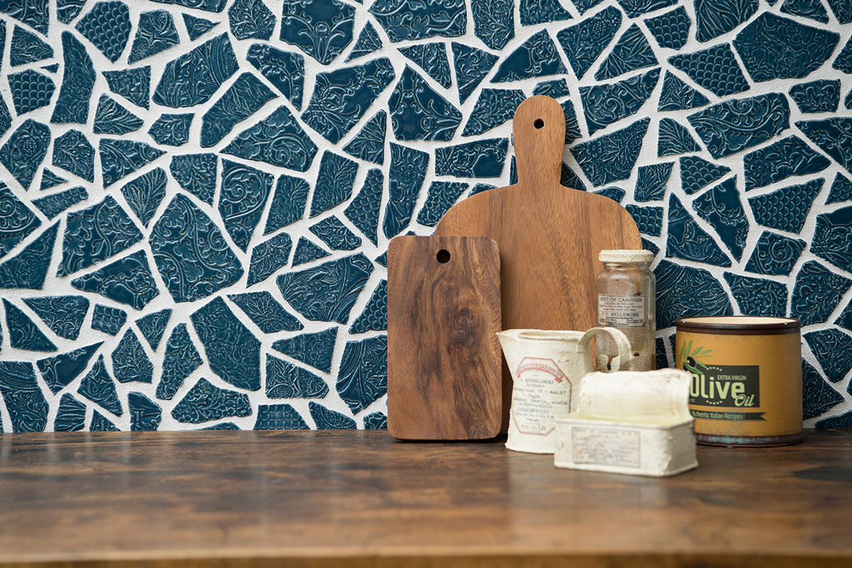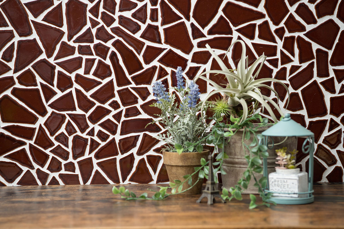 曲面・曲線に張ることができるタイルです。生産工程で人間が割っていますので同じ形状はありません。鋭角部分の縁も丸く加工しているので安全です。