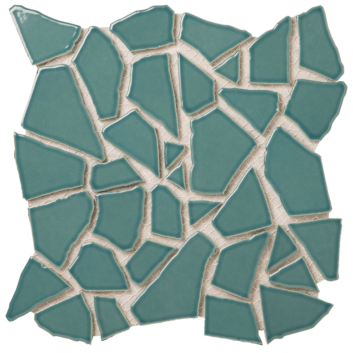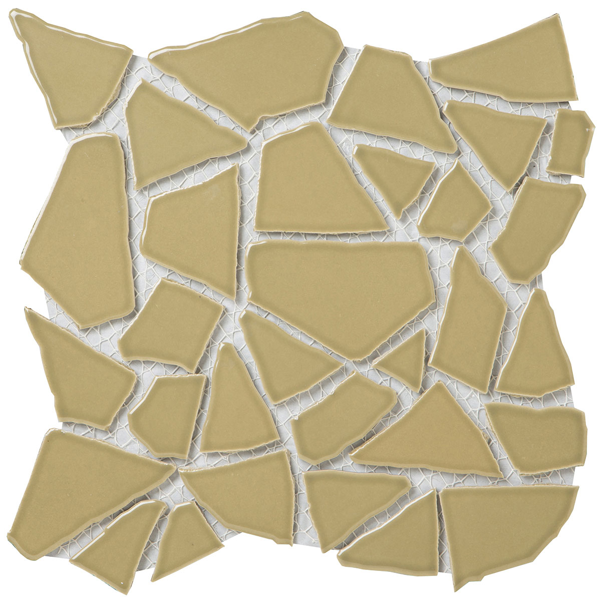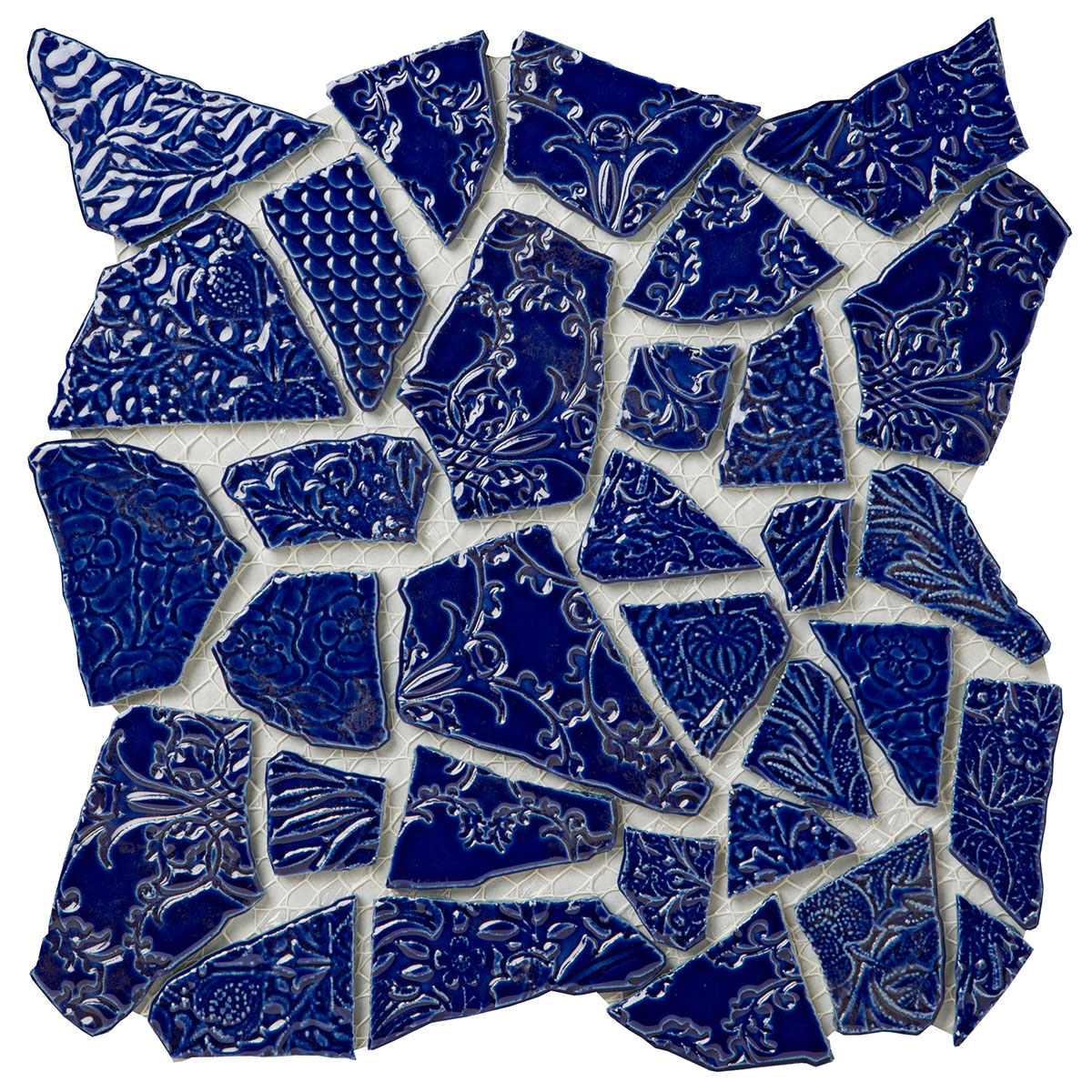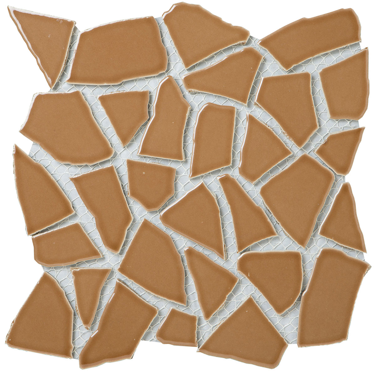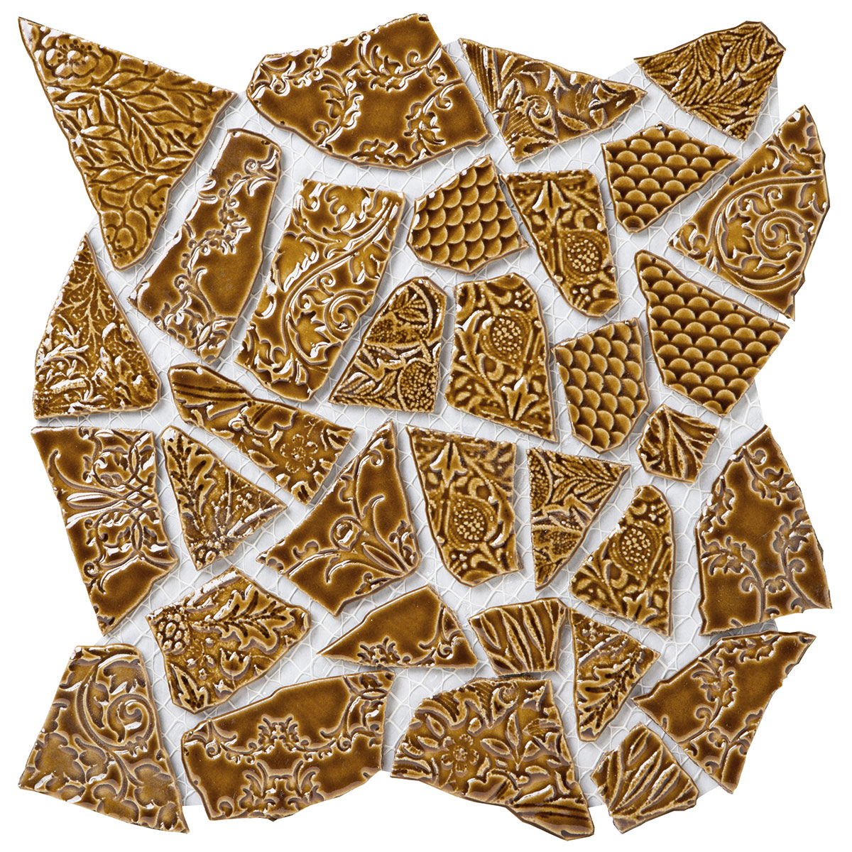 曲面・曲線に張ることができるタイルです。生産工程で人間が割っていますので同じ形状はありません。鋭角部分の縁も丸く加工しているので安全です。