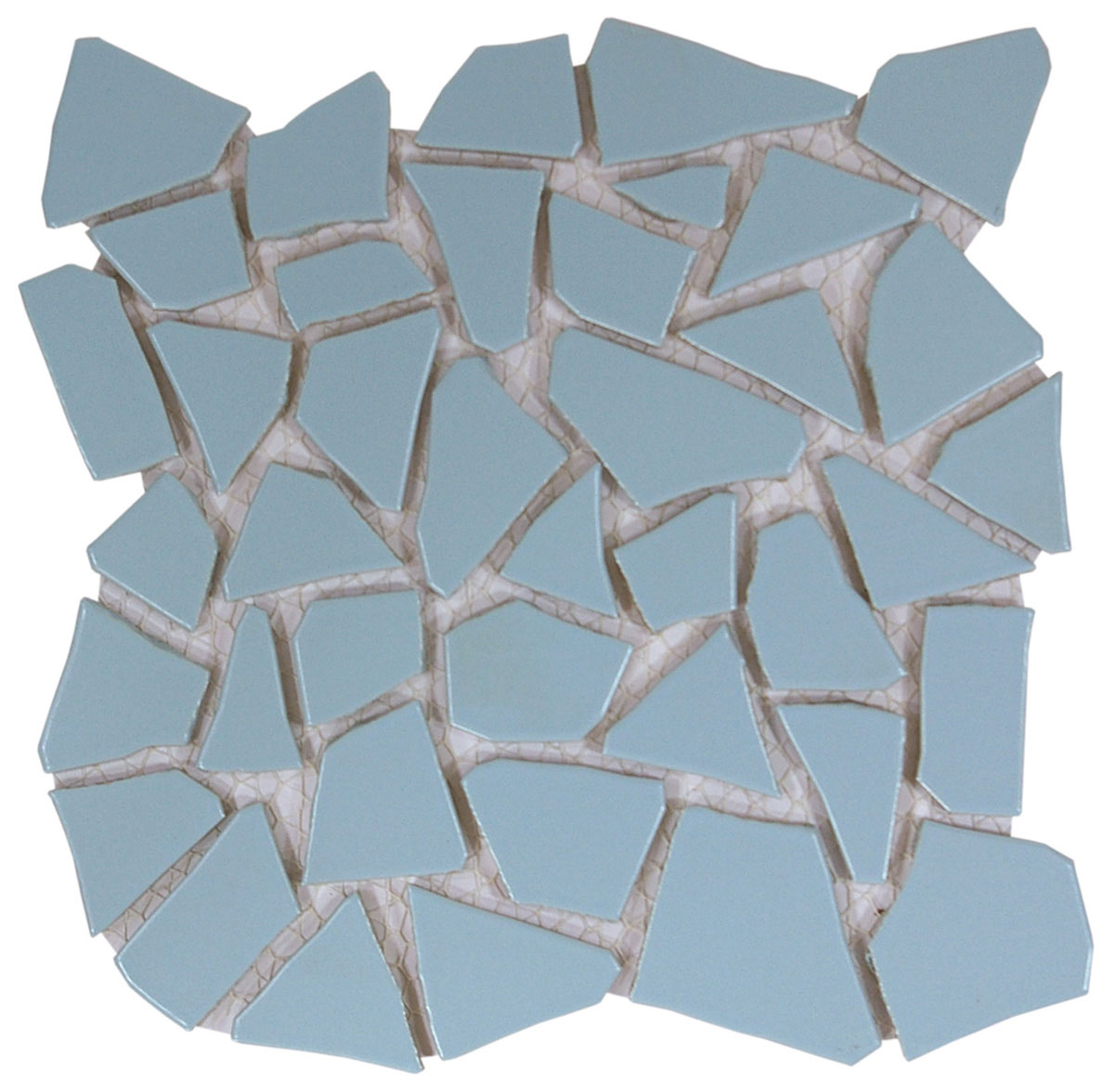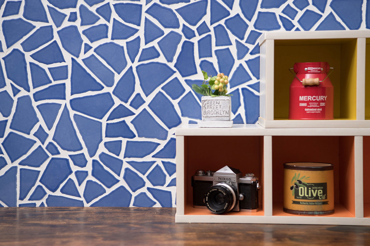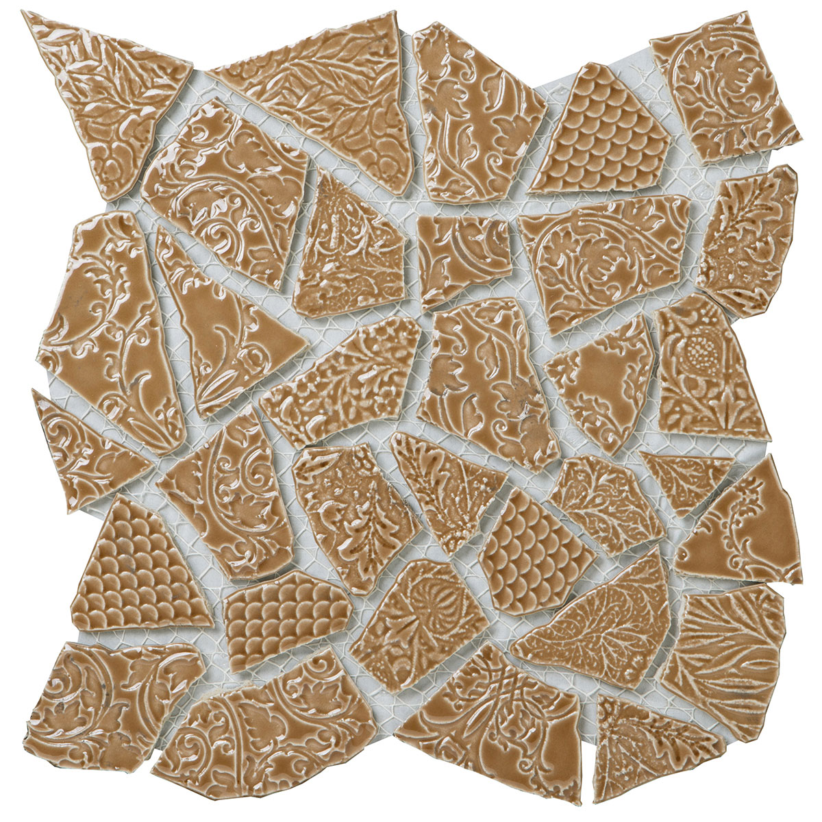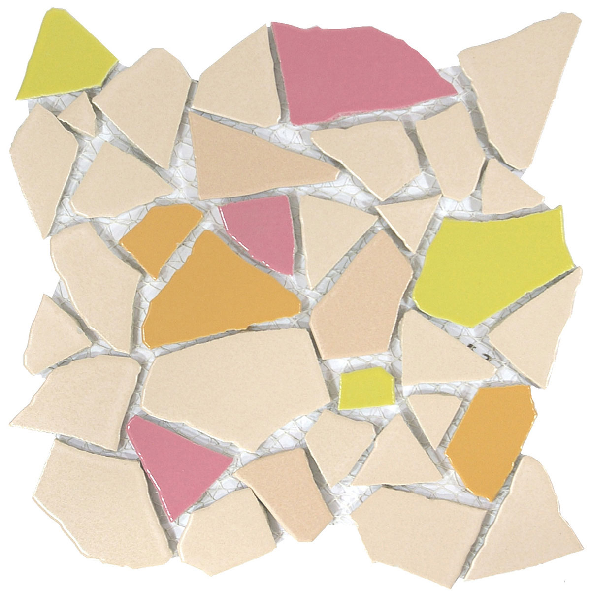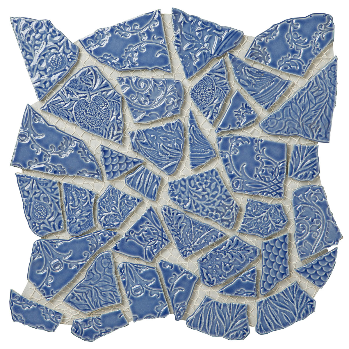 曲面・曲線に張ることができるタイルです。生産工程で人間が割っていますので同じ形状はありません。鋭角部分の縁も丸く加工しているので安全です。