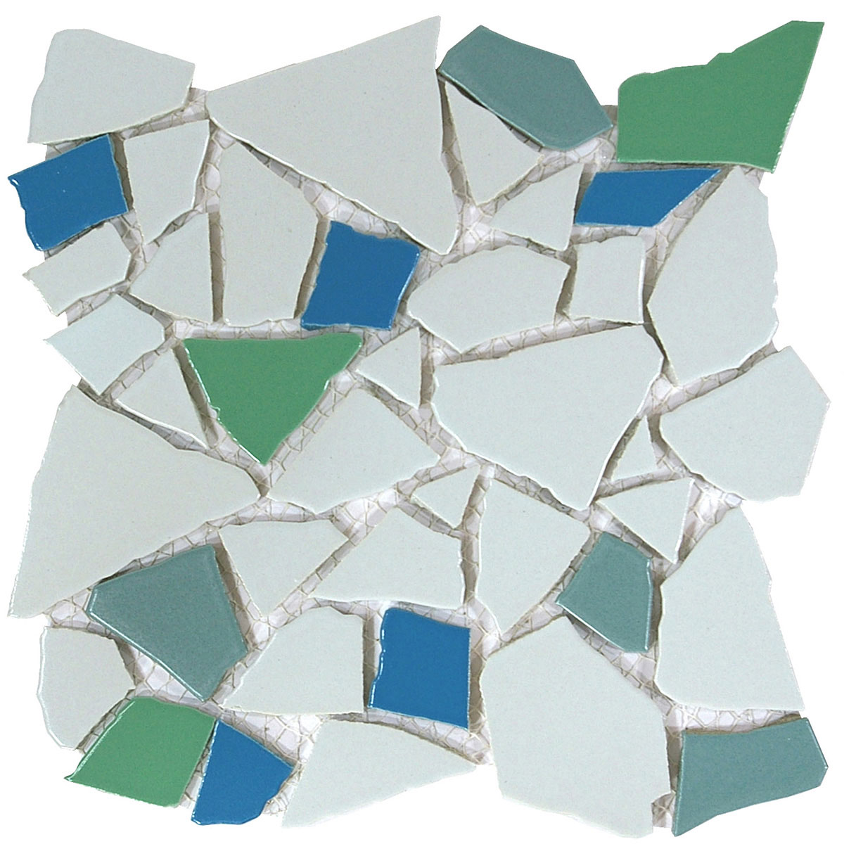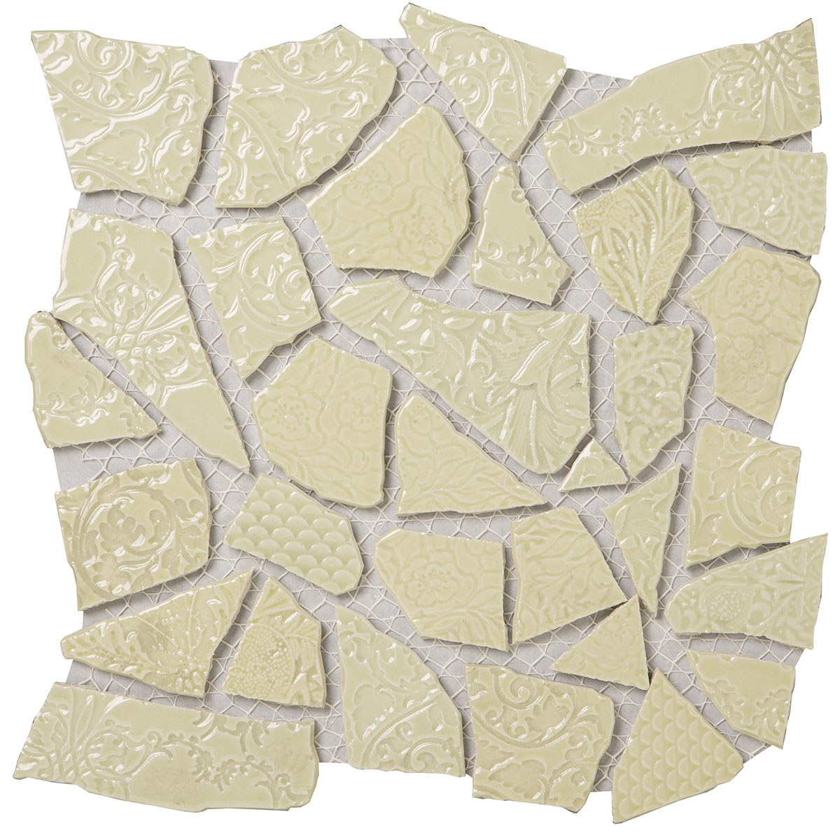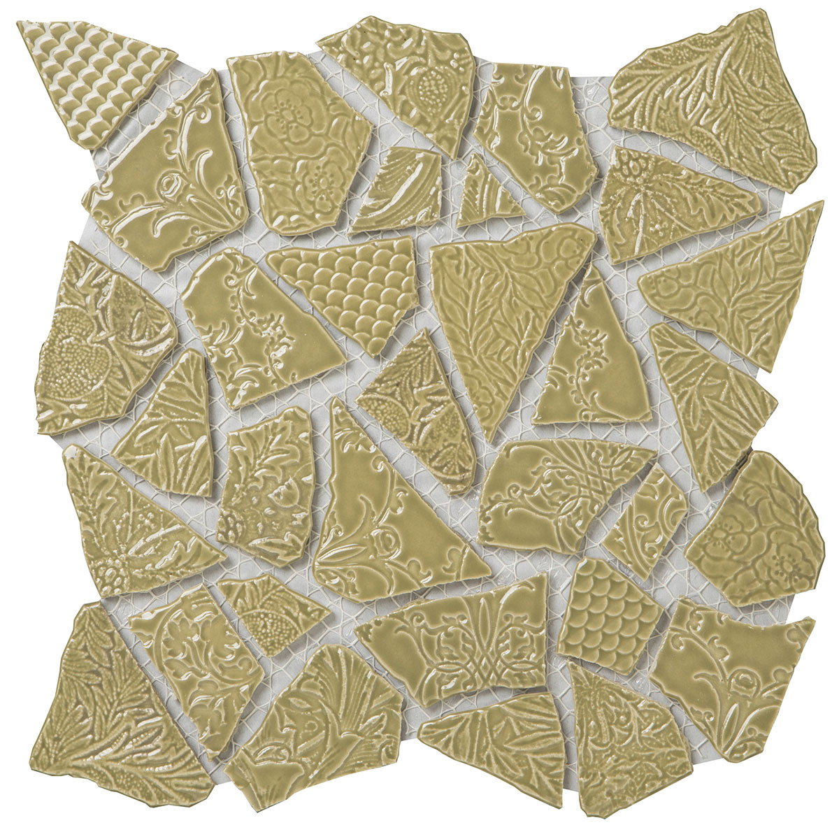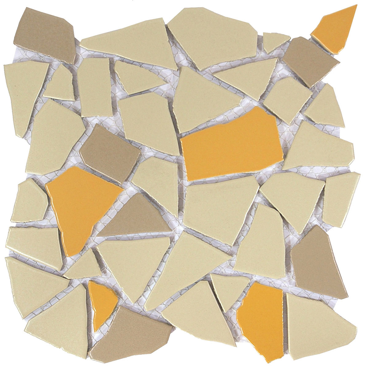 曲面・曲線に張ることができるタイルです。生産工程で人間が割っていますので同じ形状はありません。鋭角部分の縁も丸く加工しているので安全です。
