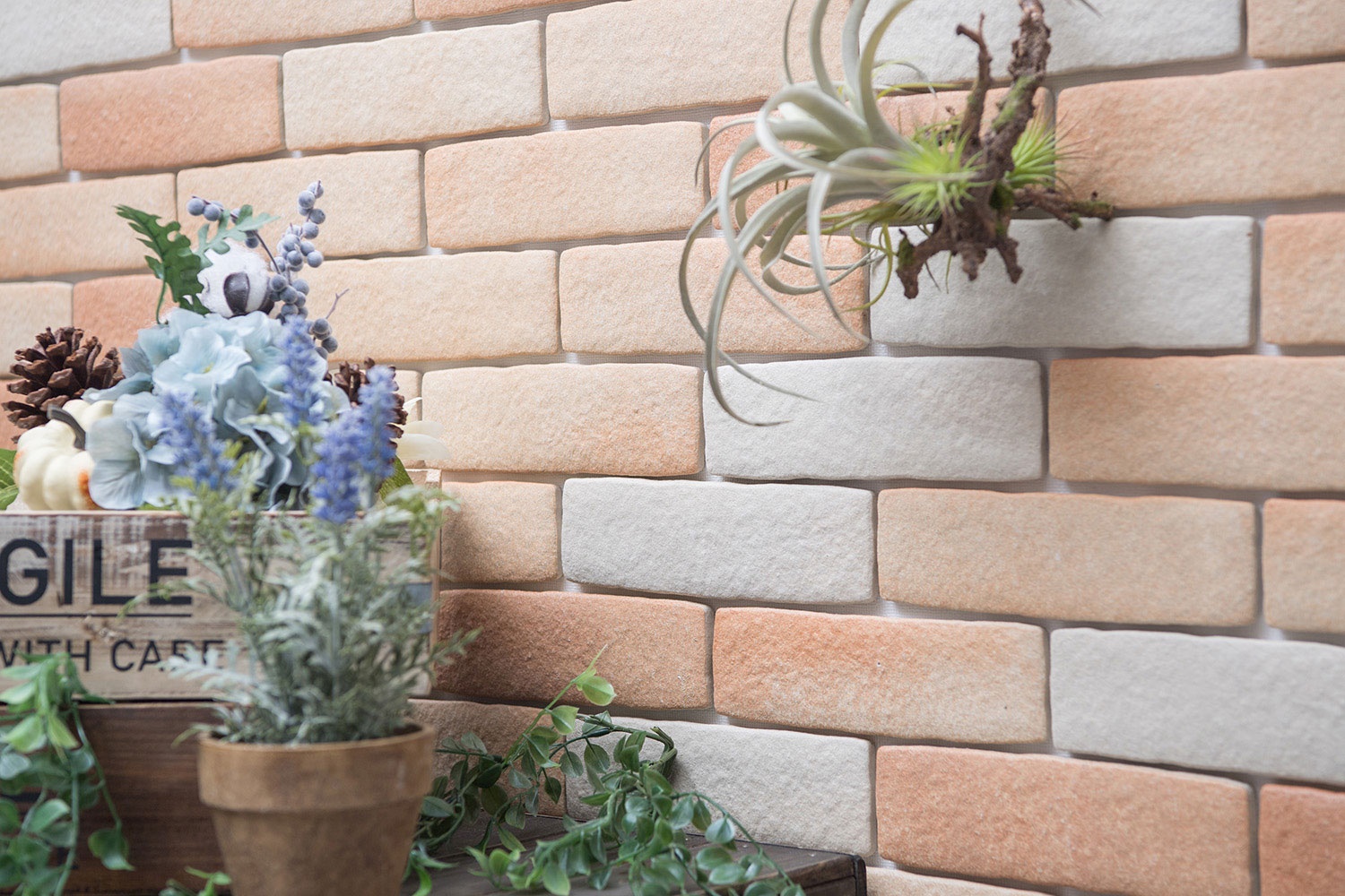 これは高い窯業技術の軽量タイルで、ブリック調(レンガ風)のテクスチャーで仕上げており、アンティークな雰囲気をDIYで、壁紙の上から貼れるという特長の軽いタイルです。